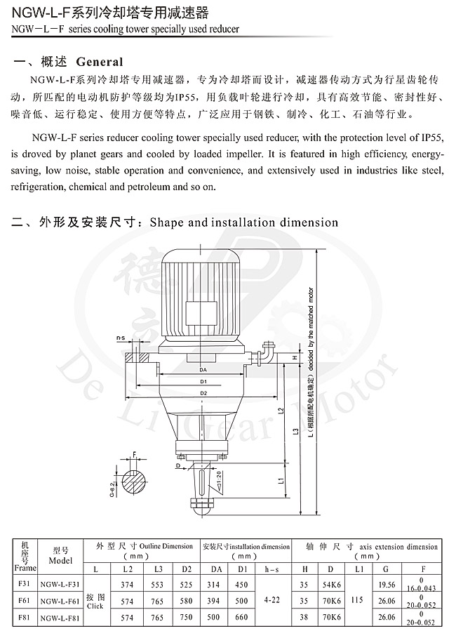 NGW-L-F系列冷卻塔專用減速器系上海交通大學(xué)設(shè)計,是專門為配套200~750T/n冷卻塔設(shè)計的新產(chǎn)品,其主要結(jié)構(gòu)為立式單級行星傳動。齒輪采用合金鋼經(jīng)高精度切削加工熱處理而成,具有強度高、韌性好、精度高等優(yōu)點,同時采用浸油式潤滑,且在密封方面作了改進(jìn),從而達(dá)到了噪音低、振動小、效率高、不漏油、壽命長的目的。己成為冷卻塔節(jié)能降噪的最理想產(chǎn)品,被廣泛用于化工、輕工、醫(yī)藥、冶金、高級賓館、民用建筑等行業(yè)。